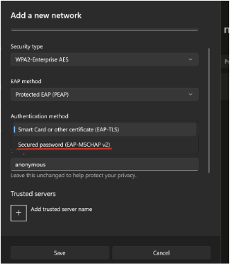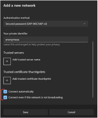 5. In the Identity field, enter holyfamily\ followed by your Holy Family username (without @holyfamily.edu). For example:holyfamily\jdoe. Note that the slash is a backslash (\), not a forward slash (/). Your version of Android, particularly older versions, may not require the holyfamily\ preceding your username. If your attempt to connect to tigerWiFi fails with holyfamily\ included, remove it and try again with just your username. Anonymous identity is not a field you are required to complete.