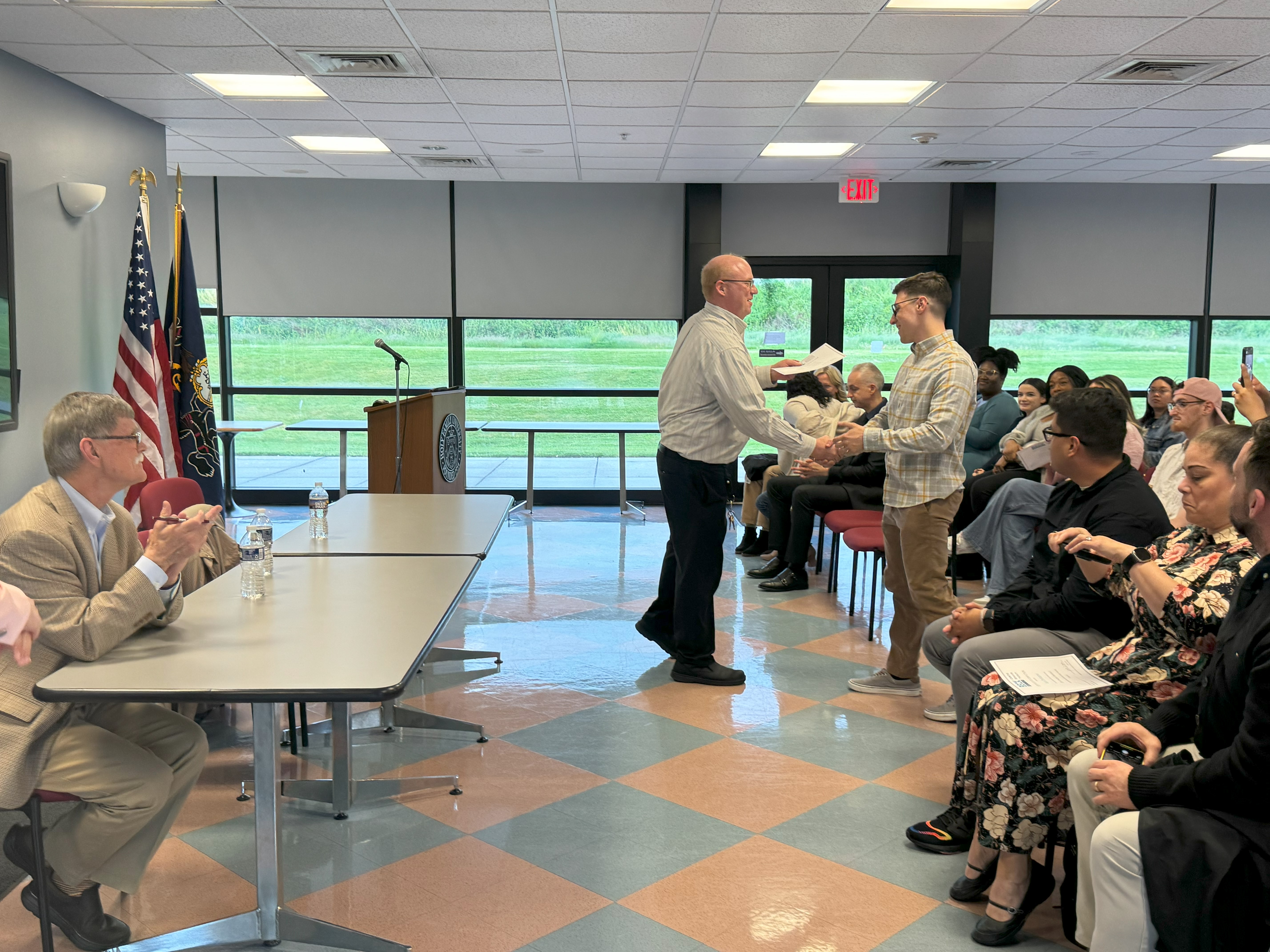 Holy Family University professor and program director of the master’s of counseling program Dr. Patrick McElwaine and acting executive director of the Beck Institute Dr. Allen Miller celebrated the achievements of 63 HFU students who successfully completed a 16-week course on Cognitive Behavioral Therapy (CBT) through the world-renowned Beck Institute. Students received certificates acknowledging their efforts during a ceremony at the University’s Newtown East campus on May 10.