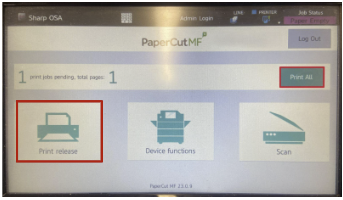 - After logging in, touch the "Print All" button on the screen. This will print all your pending jobs from the HFU-Find-Me-Print device.