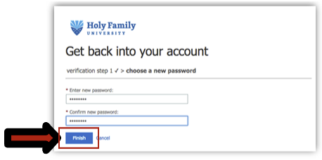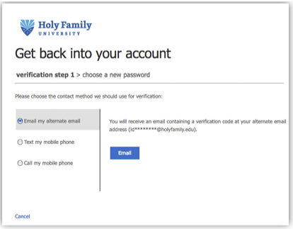 If you do not have an alternate contact method set up, you may need to contact the Holy Family University Help Desk for assistance with account recovery.